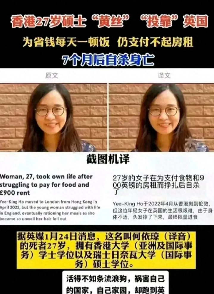 香港27岁女硕士何依琼(黄丝)拿BNO护照投奔英国,到了英国因为没钱吃饭,一天只吃一顿饭亚博电子游戏,以致连900英镑的房租皆就业不起,7个月后该女子在英国自裁身一火。